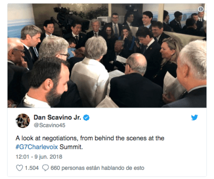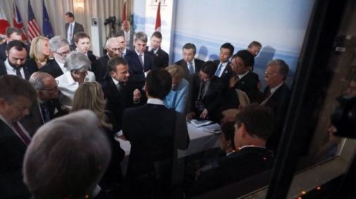 Sin dudas la foto de la cumbre del G7 que terminó ayer en Canadá fue esta de la canciller Angela Merkel mirando a Donald Trump. Simboliza la tensión y las fisuras diplomáticas entre varios países con los Estados Unidos por el tema de los aranceles a las importaciones. La foto es un ejemplo de lenguaje corporal. Merkel en el centro, en posición desafiante y retadora, con las dos manos sobre la mesa e inclinada hacia adelante. Está rodeada de otros líderes como Macron, frente a un Trump asediado, sentado de brazos cruzados pero con la mirada también desafiante.