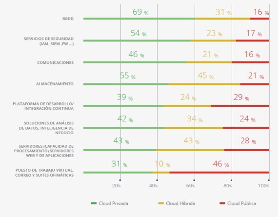 Es la nube privada quien lidera la encuesta con un 53% de preferencia por parte de los consultados, seguida de la nube híbrida (un 31%) y la pública (con un 28%). Entre las barreras que pueden frenar su implementación se destacan la amortización de las infraestructuras existentes (39%) y la seguridad (35%).