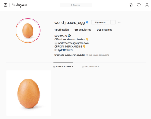 Un huevo. La foto de un huevo es hasta hoy la foto más likeada en la corta historia de Instagram: 41,6 millones de me gusta (y subiendo). Fue posteada apenas hace 10 días por la cuenta @world_record_egg, que ya tiene 6 millones de seguidores, a pesar de haber publicado solo esa foto (la del huevo).