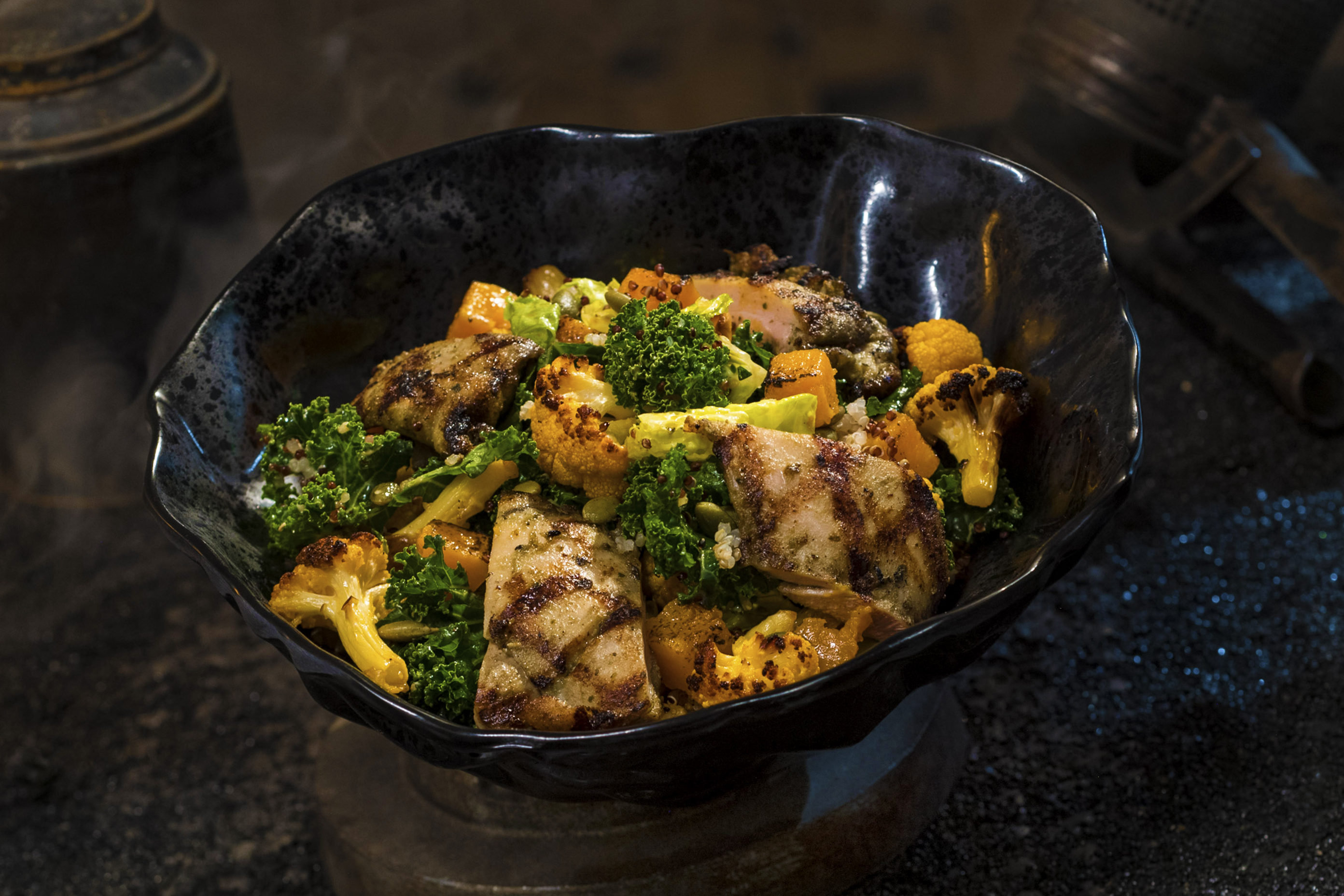 Innovative and creative eats from around the galaxy will be available at Star Wars: GalaxyÕs Edge when it opens May 31, 2019, at Disneyland Park in Anaheim, Calif., and Aug. 29, 2019, at Disney's Hollywood Studios in Lake Buena Vista, Fla. The Oven-roasted Tip Yip, found at Docking Bay 7 Food and Cargo inside Star Wars: GalaxyÕs Edge, features roasted chicken with mixed greens, roasted vegetables, quinoa and pumpkin seeds with a creamy green curry ranch dressing. (David Roark/Disney Parks)