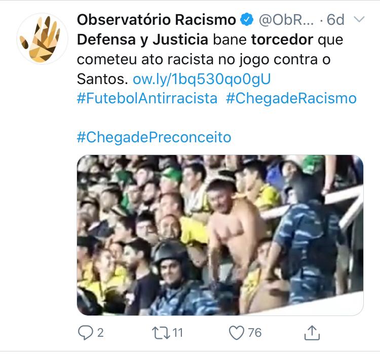 A las pocas horas, el Observatorio de racismo de Brasil se hizo eco (@ObRacialFutebol, con casi 20 mil seguidores) y denunció el hecho ante la Conmebol, exigiendo que la institución tome medidas disciplinarias.