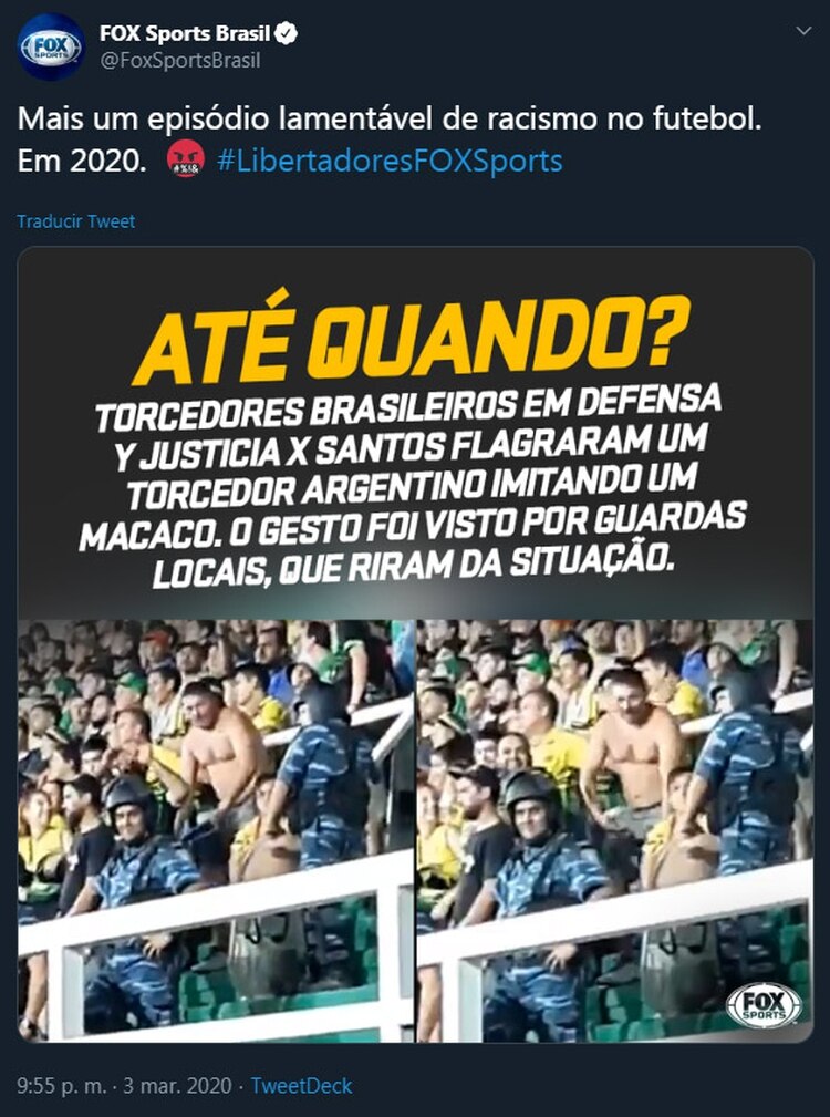 A las pocas horas, el Observatorio de racismo de Brasil se hizo eco (@ObRacialFutebol, con casi 20 mil seguidores) y denunció el hecho ante la Conmebol, exigiendo que la institución tome medidas disciplinarias.