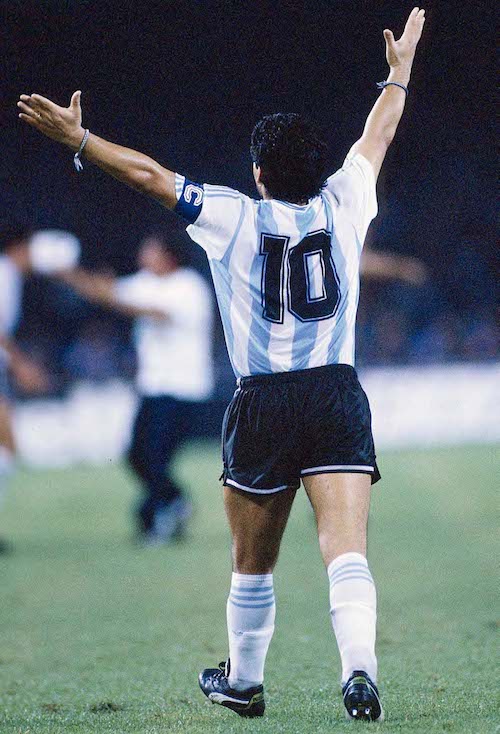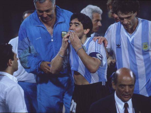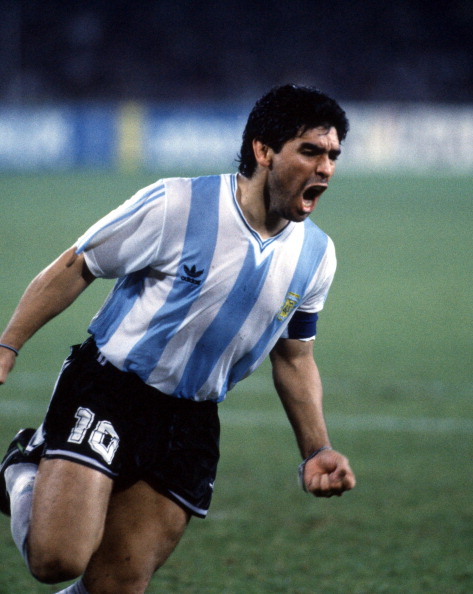 3/7/1990 World Cup 1990 – Italy v Argentina, Diego Maradona celebrates against Italy. (Photo by Mark Leech/Getty Images)