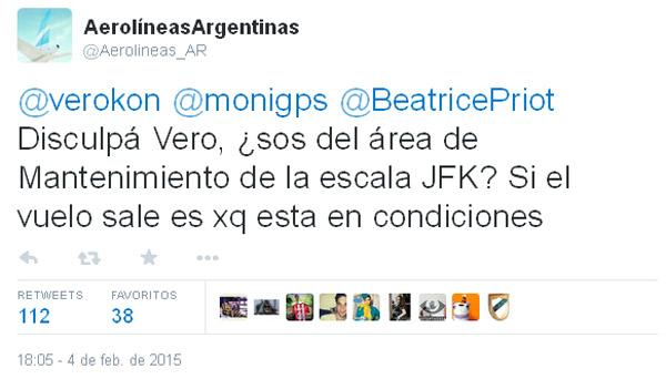 ¿Qué hizo la cuenta oficial de Aerolíneas? Todo lo que no se debe hacer. Le respondió de forma irónica: “Disculpá Vero, ¿sos del área de Mantenimiento de la escala JFK? Si el vuelo sale es xq esta en condiciones”.