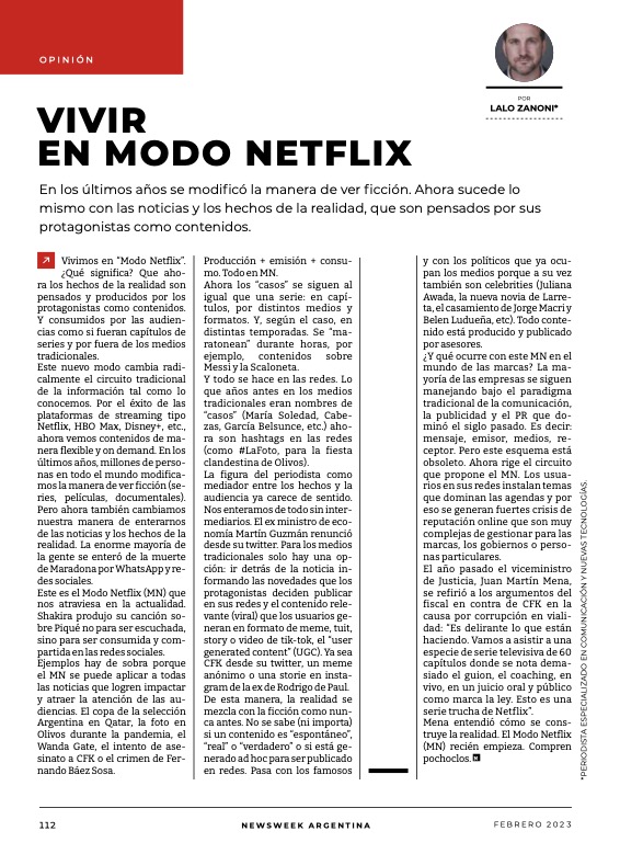 Vivimos en “Modo Netflix”. ¿Qué significa? Que ahora los hechos de la realidad son pensados y producidos por los protagonistas como contenidos. Y consumidos por las audiencias como si fueran capítulos de series y por fuera de los medios tradicionales.